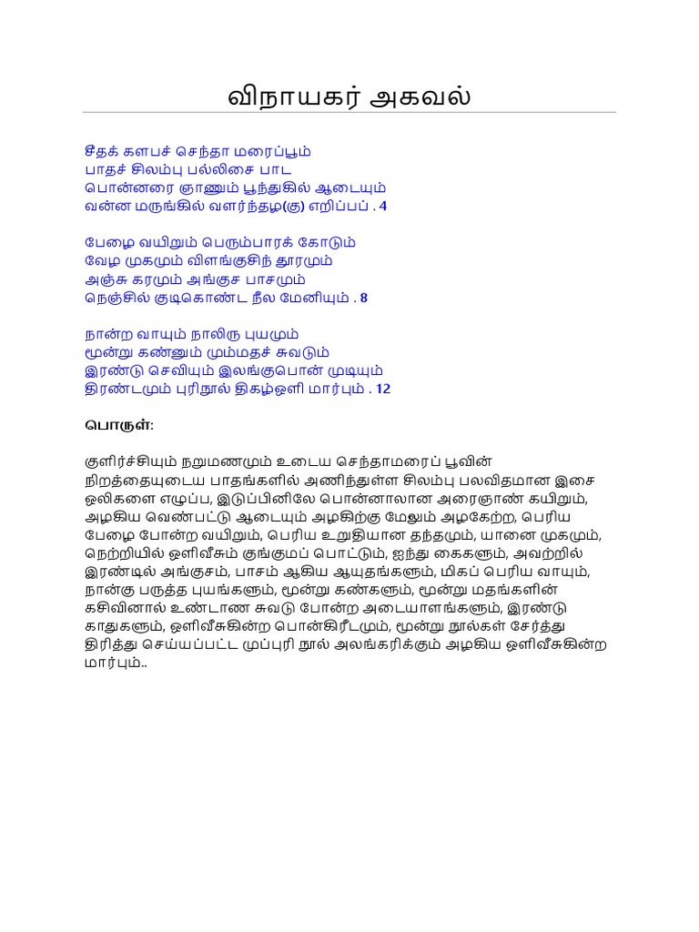 Vinayagar Agaval is considered to be his greatest poem. Vinayagar Agaval in Tamil pdf. Vinayagar Agaval defines a religious path part of the Tamil devotional tradition of Bhakti within the Hindu philosophy of.